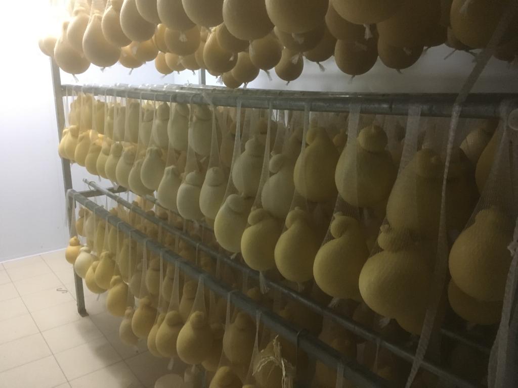 Per quanto riguarda la bovina, facciamo i caciocavalli, i caciocavalli affumicati, i caciocavalli con le olive, speziati, piccanti, con la soppressata. Facciamo un caciocavallo da mangiare fresco, tipo uno scamorzone che va bene dal primo giorno a un mesetto. Poi, facciamo dei caciocavalli scamosciati, che è un termine che usa la gente del posto, che sarebbe un caciocavallo non fresco e non stagionato da mangiare dai due mesi ai tre-quattro mesi. Poi, facciamo il caciocavallo che va stagionato da un anno a due-tre in base a quello che si vuole. Facciamo sia quello stagionato fuori, con gli sbalzi termici che la natura ci dà, sia quello nelle celle di stagionatura.