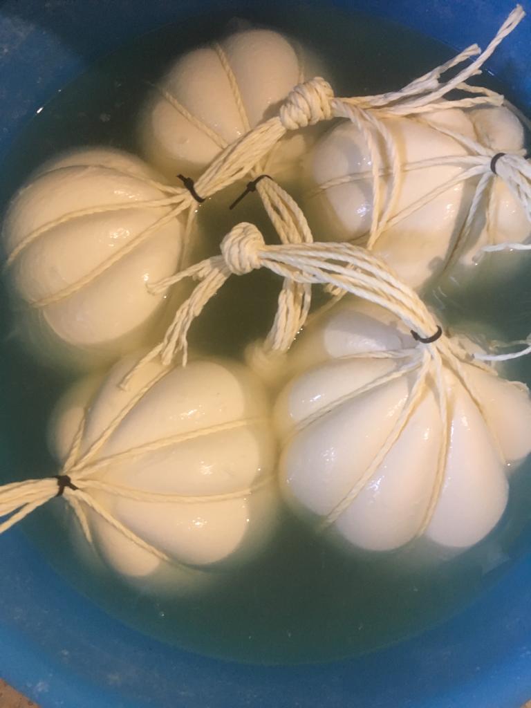 Poi, facciamo le manteche. Noi il burro lo tiriamo dalla ricotta, perché non essendo il caseificio ancora in funzione, non abbiamo la schermatrice. Quindi, lavoriamo le ricotte del giorno prima che vengono messe ad asciugare appese in un telo, per cui scorre tutto quanto più siero è possibile e il giorno dopo viene fatto il burro mantecato che poi viene rivestito dalla sfoglia del caciocavallo normale. Questo prodotto va bene da mangiare dai tre giorni a un mesetto, fino a 2-3 mesi. Nel periodo invernale può stare anche cinque mesi, mentre nei periodi estivi se non c’è la la cella, il burro dentro si squaglia, cola e non va bene.