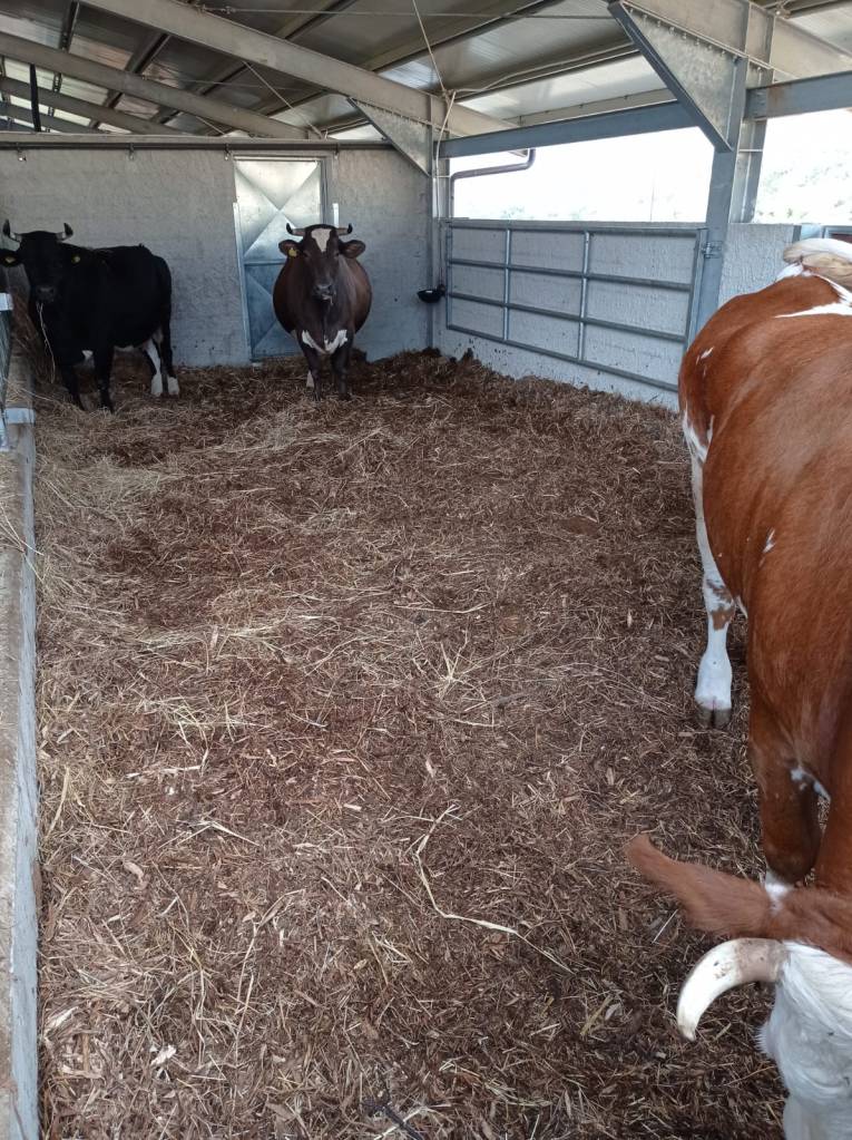 Partiamo dalle cose più nuove. Quest’anno, dopo tre anni di lavoro abbastanza duri anche per il CoVid-19, abbiamo inaugurato una nuova stalla. All’interno della stalla abbiamo un sistema di lettiera profonda. La nuova stalla è stata progettata per questo ed è stata inaugurata un mese e mezzo fa. Abbiamo un sistema di lettiera, chiamato lettiera profonda, che deriva da un progetto israeliano, la compost barn [la stalla compost]. Praticamente, questo è un sistema di lettiera con uno spessore minimo di lavoro intorno ai 35 centimetri per le capre e intorno ai 50 centimetri per le vacche.