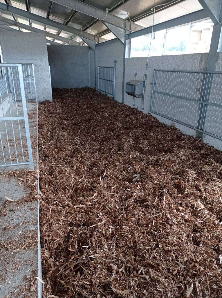 Al momento, essendo ancora una fase di sperimentazione, il ragionamento è sempre lo stesso, vedere che scarti hai a disposizione. Noi l’abbiamo fatta con la miscela di circa 50 e 50 di paglia, che è di nostra produzione dato che coltiviamo cereali, e queste scorze di pali di castagno. Quindi, hai questo grande spessore di carbonio, principalmente di sostanze carboniose, che per far partire un processo di compostaggio dobbiamo ribilanciare con l’azoto. L’azoto ce lo mettono gli animali con le loro deiezioni. La nostra sperimentazione è proprio fresca, ma dopo una quindicina di giorni si arriva al giusto livello di umidità e al giusto bilanciamento fra il carbonio, che abbiamo messo come lettiera, e l’azoto che danno gli animali con le deiezioni sia liquide sia solide.