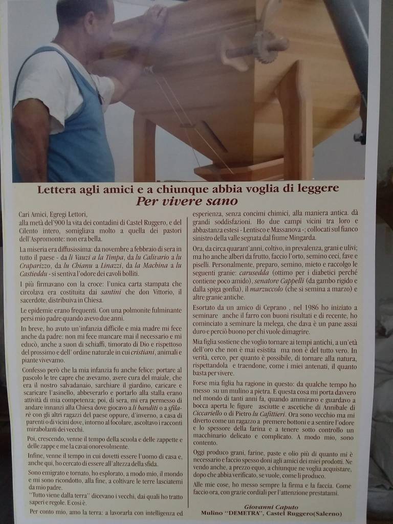 Giovanni Caputo, un “grande vecchio” del Cilento, un uomo saggio, ma anche d’azione, alleva una ventina di pecore e, insieme a sua figlia Francesca, ha messo in piedi il molino a macinazione in pietra che si chiama La Spigolatrice ed è certificato biologico, a Castel Ruggiero nel comune di Torre Orsaia. Giovanni ci racconta il Cilento di ieri e di oggi. Indica la strada da percorrere fatta di un gusto equilibrio tra i saperi della tradizione e quelli dell’innovazione contemporanea. L’obiettivo è produrre reddito mantenendo un rapporto sostenibile tra uomo e natura.