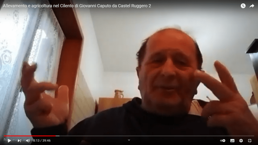 Alessandro Scassellati (AS): Salve a tutti. Siamo con Giovanni Caputo, un cittadino di Castel Ruggero che è una frazione di Torre Orsaia. Conosco Giovanni da diversi anni e so bene che lui è una sorta di contadino e allevatore filosofo, nel senso che ha un pensiero spesso, di una certa sostanza, di un certo peso. E’ un grande osservatore e anche uno storico della memoria del Cilento, ma è soprattutto un agricoltore allevatore che ha cercato di riportare in Cilento la coltivazione del farro e di altri cereali che tradizionalmente si coltivavano e si consumavano. Ha messo in piedi insieme con sua figlia Francesca un mulino che si chiama La Spigolatrice a Castel Ruggero. Un mulino certificato biologico e in Cilento ce ne sono solo due. Un mulino che macina in pietra, con un’attenzione particolare per la molitura di cereali autoctoni, cereali antichi. Poi, lui ha i suoi terreni, terreni che vengono dalla famiglia, e li coltiva producendo farro, cereali, verdure, frutti antichi. Ha le galline e circa una ventina di pecore.
