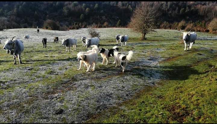 GP: C’è un casolare dentro il terreno. Non c’è un ricovero per le mucche. Loro stanno sempre all’aperto, sempre fuori tutto il giorno. I formaggi li faccio solo quando c’è l’erba buona, non sempre, perché il latte lo faccio bere ai vitelli per farli crescere prima, così li vendo prima. Per non farli mangiare dai lupi cerco di farli crescere il prima possibile, sacrificando il latte. Ho sei cani maremmani. Erano sette e uno me lo hanno ammazzato i lupi.