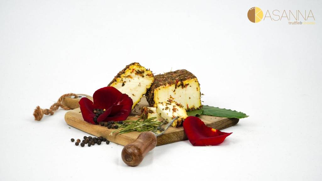 Piano piano è incominciato quel passaparola di Kasanna. In molti dicevano che Kasanna faceva un caciocavallo al tartufo che è meraviglioso. Quello è stato il trampolino di lancio per decidere di fare questo questo lavoro e questa attività. Da quel momento in poi sono andato avanti con il caciocavallo al crusco, fino a quando sono passato alle paste molli. Così mi sono inventato paesano, che è un formaggio di capra, come il precedente saracino, a crosta fiorita, però affinato con polvere di peperone rosso dolce, olive nere e finocchietto. Con questi tre ingredienti noi facevamo le olive infornate. Ho dato vita allo strafino che è un formaggio a pasta tenera di latte di mucca, affinato con fiori di malva, rosmarino, timo, liquore alle noci, perché qui da noi c’è un produttore di liquore di noci e insieme a lui abbiamo studiato questa ricetta. Il mino con lo zafferano Montesano. Pure questo è un formaggio di latte di mucca, affinato con lo zafferano e poi all’esterno con boccioli di biancospino e fiori di calendula.